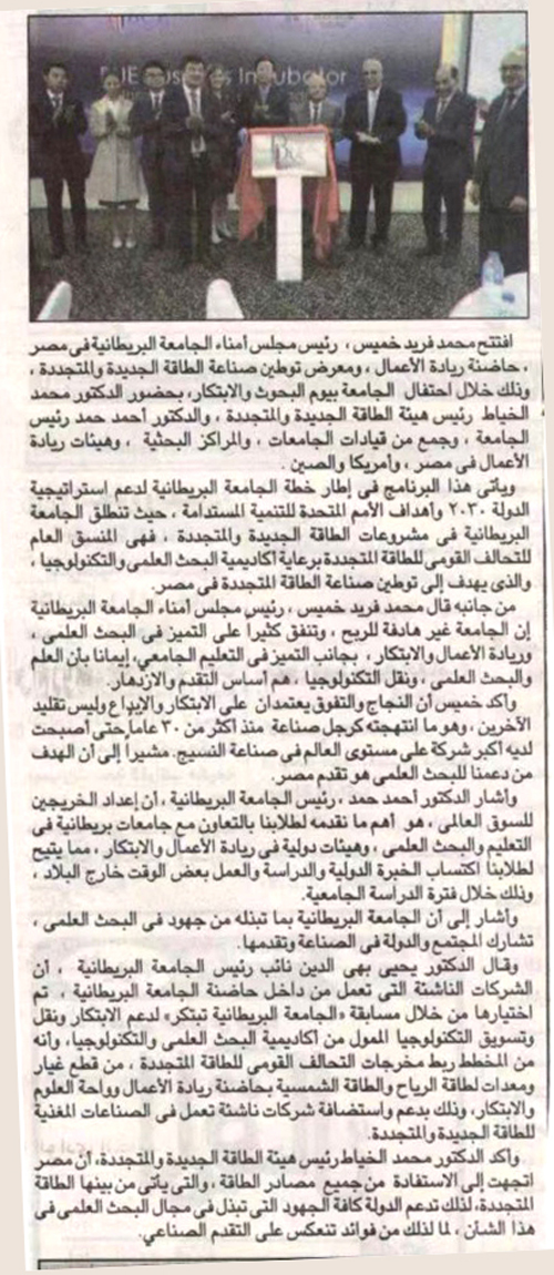 孵化器啟動(dòng)儀式選擇與大不列顛大學(xué)的科研創(chuàng)新日同日舉行,體現(xiàn)了大不列顛大學(xué)在培養(yǎng)合格畢業(yè)生以及科研人才方面做出的努力,也表明了學(xué)校培養(yǎng)學(xué)生和科研人員創(chuàng)新創(chuàng)業(yè)能力的決心。孵化器的啟動(dòng),將鼓勵(lì)大不列顛大學(xué)校內(nèi)的創(chuàng)新與創(chuàng)業(yè),并為其到BUE科技創(chuàng)新園創(chuàng)業(yè)奠定基礎(chǔ)。位于開(kāi)羅沙魯克城的BUE科技創(chuàng)新園,將于今年12月1日開(kāi)業(yè)。