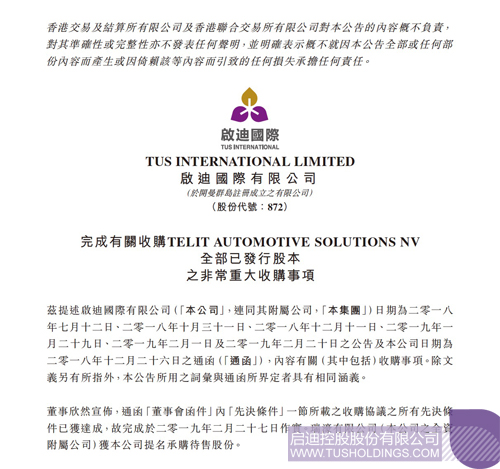 2019年2月27日,啟迪國際有限公司(股票代碼: 872.HK,以下簡稱“公司”或“啟迪國際”)發(fā)布公告:公司連同其附屬公司收購Telit車載通訊業(yè)務(wù)之所有先決條件已獲達成,正式完成收購,目標公司及其附屬公司成為啟迪國際的全資子公司。在此之前的2018年7月12日,啟迪國際宣布以1.05億美元(約8.24億港元)收購Telit車載通訊業(yè)務(wù),進一步強化集團智能駕駛系統(tǒng)業(yè)務(wù)布局。