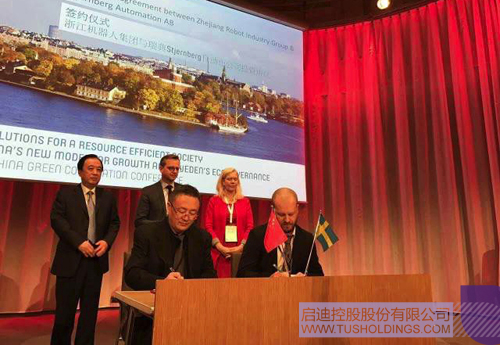 ▲ 啟迪金服總經理、浙江機器人產業集團總經理朱春榮與瑞典浣貝爾公司代表簽約