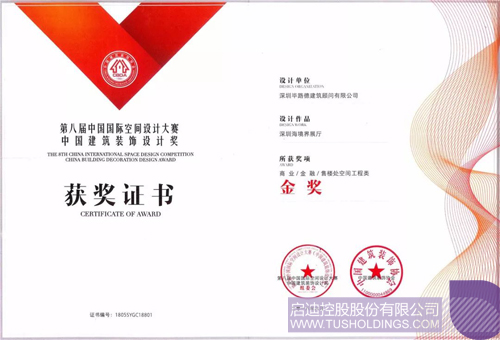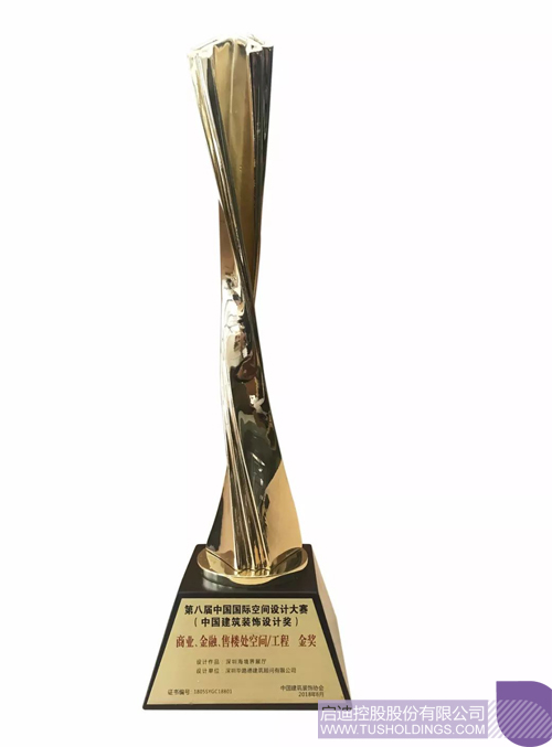 “中國(guó)建筑裝飾設(shè)計(jì)大獎(jiǎng)”售樓處空間工程類金獎(jiǎng)證書及獎(jiǎng)杯