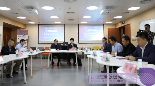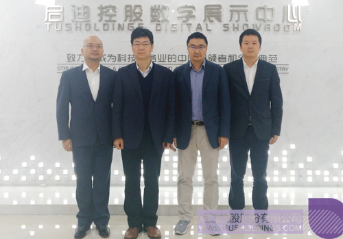 房漢廷副社長(左二)、劉峰總編輯(右二)座談會后參觀考察啟迪控股數字展廳
