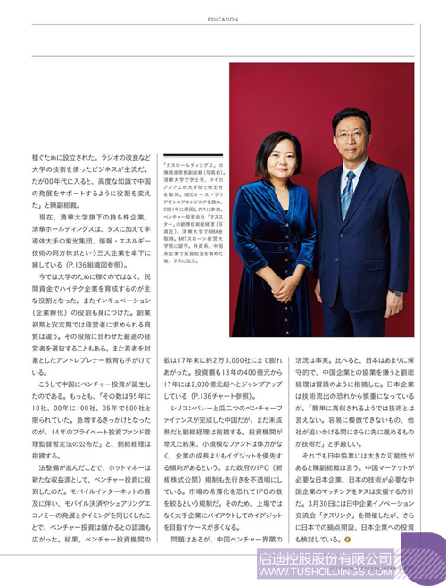 啟迪控股是清華大學(xué)的“校辦企業(yè)”,總資產(chǎn)達(dá)2000億元(約3兆4000億日元)。20世紀(jì)80年代到90年代,隨著政府機構(gòu)改革的深入,中國的大學(xué)開始設(shè)立自己的公司。啟迪控股的前身為清華科技園發(fā)展中心,成立于1994年,是許多清華大學(xué)企業(yè)的聚集地。2004年正式更名為啟迪控股。