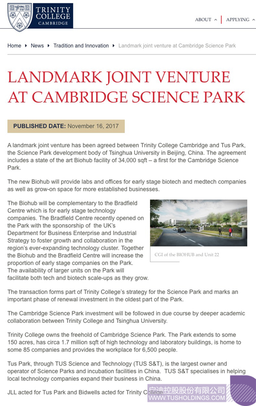 劍橋大學三一學院官方發(fā)布:https://www.trin.cam.ac.uk/news/landmark-joint-venture-at-cambridge-science-park/(點擊圖片閱讀)