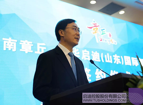 韓偉在致辭中表示,章丘搶抓歷史機遇,正全面實施交通、生態、產業、城鎮四大提升工程,著力打造山、泉、河、湖、城和諧共融的現代化山水園林城市,加快構建產業高地和宜居新區,全區綜合競爭力、對外吸引力日益增強。他提出,章丘區將集中力量、加大力度、全面做好山東啟迪國際智慧科技城項目的落地保障工作,依托章丘的良好發展環境和啟迪控股的雄厚實力,早日將具有科技引領、項目孵化、輻射帶動共贏的智慧科技城呈現在齊魯大地。