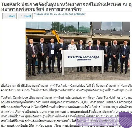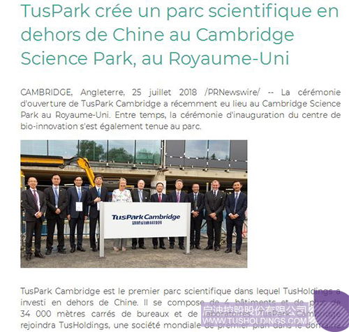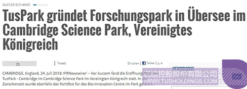 近日,由啟迪控股在英國劍橋投資建設的劍橋啟迪科技園(TusPark?Cambridge)舉辦開幕儀式和園區生命科技創新中心(Bio-InnovationCentre)封頂儀式,該活動在全球范圍內引起廣泛關注,位于美國、法國、意大利、德國、英國、加拿大、瑞士、葡萄牙、俄羅斯、日本、新加坡、韓國、澳大利亞、印度、泰國、印度尼西亞、馬來西亞等國家和中國香港、澳門、臺灣地區的共計數百家媒體對此進行了不同形式的報道。